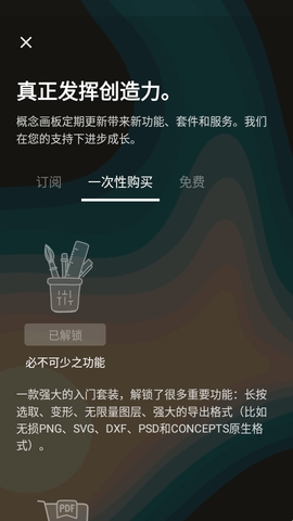 2、必不可少的套装功能极强大,包括可编辑笔画、解锁无限量图层、导出为PNG/SVG/概念画板原生格式等。此外,专业版还提供表现强大的笔刷套装,为画作增添风格和效果。