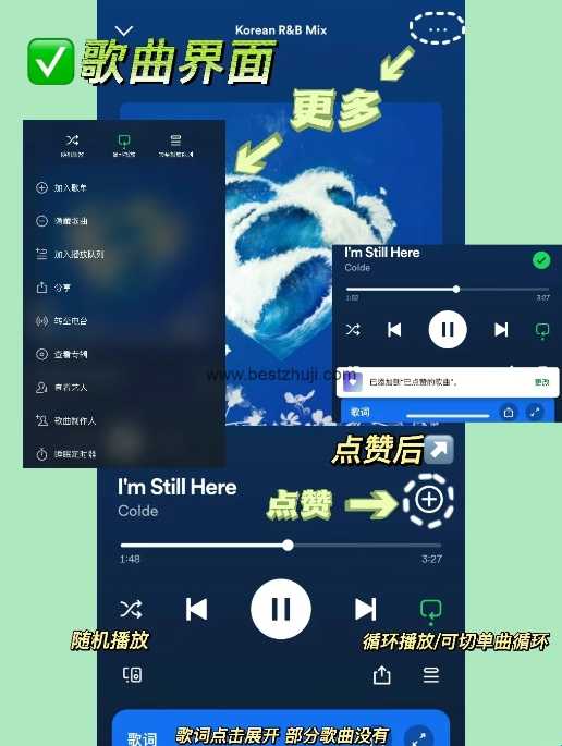 三点按钮 →加入歌单;歌曲面板→加号点赞