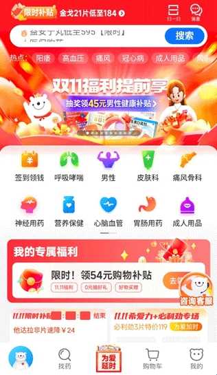 涵盖了海量优质上架药品,包括家中带备药(感冒发热、头痛压疼、肌肉关节创伤等)、保健养生(蛋白质、维生素/矿物质、美容补血等)、专科用药(肝病、肿瘤、糖尿病等)、男性用药(强肾健体、速效壮阳等)、成人用品等。药品涉及医药领域方方面面,一应俱全,让用户一站式购健康。
