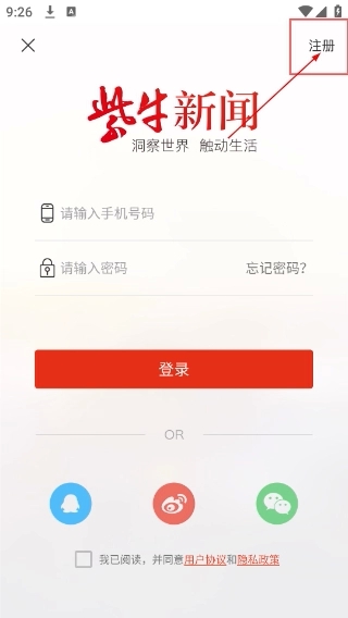 3、在登录页面,点击右上角的“注册”按钮,切换至手机注册的信息填写界面。