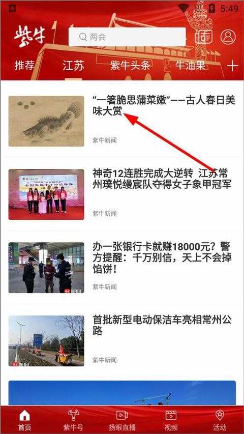 1、打开紫牛新闻app,登录进入首页,用户可在首页查看推荐新闻、本地新闻、紫牛头条、快讯、时政新闻等,点击新闻;