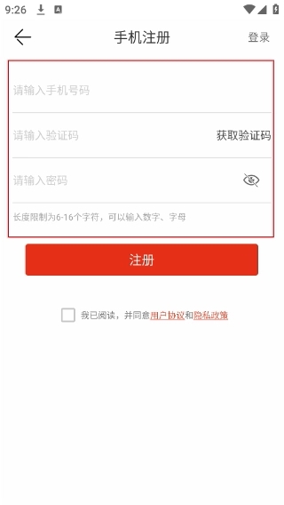 4、在手机注册页面,依次填写手机号、获取并输入验证码、设置密码,完成账号注册流程。