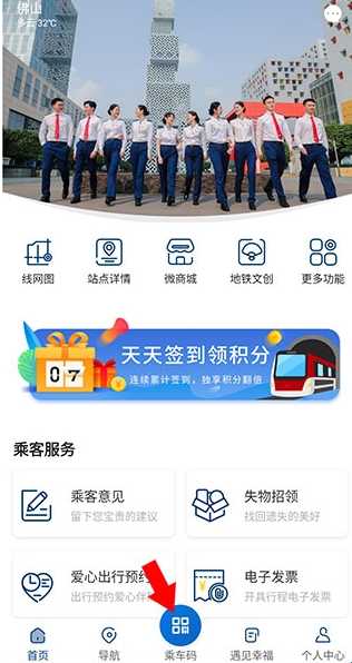 1、下载并打开佛山地铁app,点击下方中间的乘车码按钮