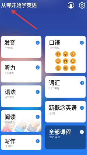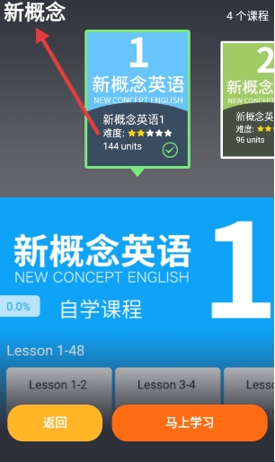3、新概念英语板块展示4个课程,含新概念英语1、2册,标明难度和单元数,新概念英语1可自学按课学习。