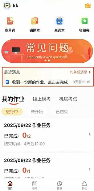 3、加入班级后,就可以看到老师布置的作业和考试任务。
