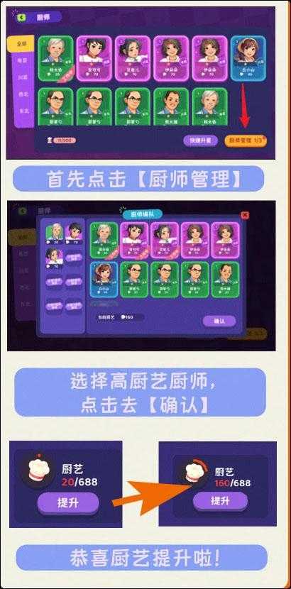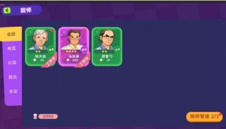 1、上阵更多的厨师,在厨师界面点击厨师管理,然后选择高厨艺厨师,最后点击确定就可以上阵了。