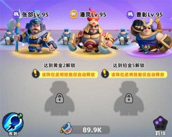 1、曹彰+张邰+任意单卡,组成二魏羁绊,武将品质为2橙一紫,战力尚可。