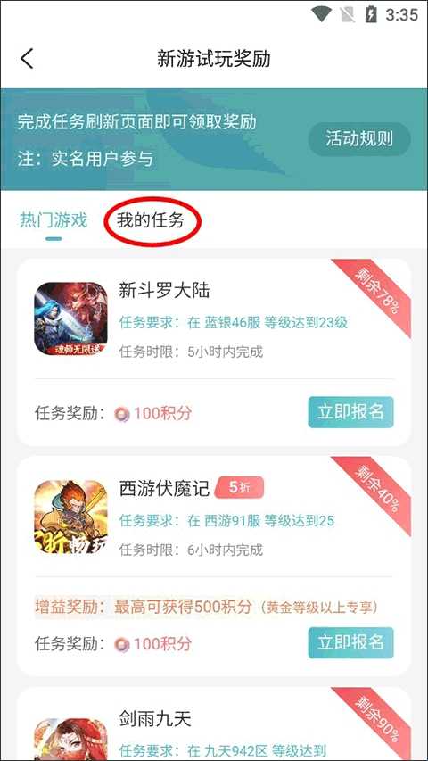 进入后就可以看见所有的任务了,大家也可以点击我的任务来查看自己接取的任务,等获取了足够的积分就可以换取平台金了。