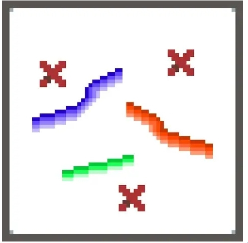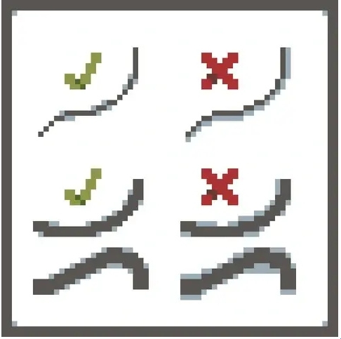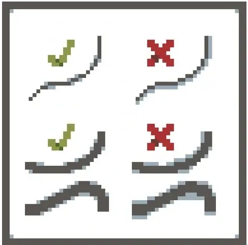 线条可说是像素艺术中最重要的元素之一。线条应当是连续的,不可以有断点。否则,它们就会在你的图画中造成一种不和谐感。断裂的线条叫做锯齿现象。线条的粗细应当始终一致。并且,不建议同一根线条中存在 2像素的宽度(有时存在例外)。想要在像素画板中画出完美的线条,只需使用钢笔工具。