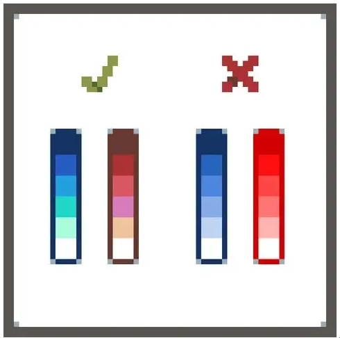 初学者最常犯的错误就是尽可能选择明亮的颜色,还有条状渐变 (请看上一节)。颜色之间的反差不仅可以使用亮度来表现,也可以使用色调。为了使绘图过程更快,效果更好,你可以使用现成的调色板。最著名的调色板来源之一是 lospec.com/palette-list(该网站国内可访问,英语界面不会过多影响你的使用)。在像素画板中你可以从 RGB (红,绿,蓝)颜色模式切换到 HSV (色相,饱和度,明度)模式 ,这可以帮助你选择正确的颜色。