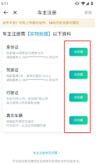 (4)证件补全的车主,可先上传部分证件,14天内补全即可提交审核,审核通过后就可以开始接单了