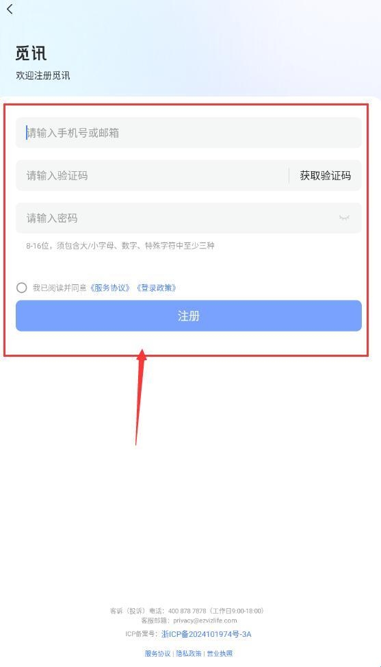3、输入手机号、邮箱、和收到的验证码,设置好密码,点击注册即可