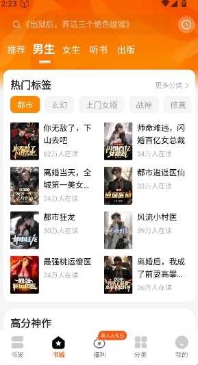 书城页面可根据推荐、标签或直接搜索找到心仪的小说。