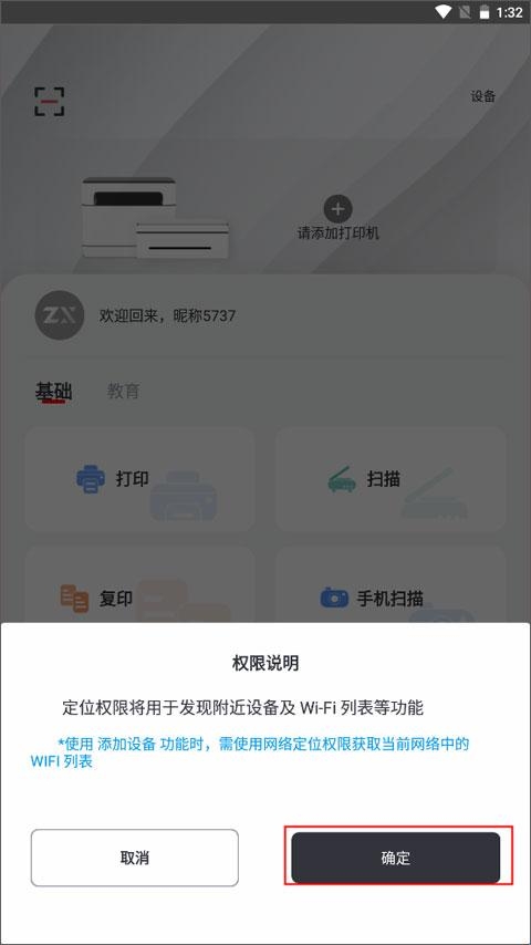 (2)页面下方弹出一个权限说明,需要开启定位权限来用于发现附近设备及WiFi列表等功能,点击确定。