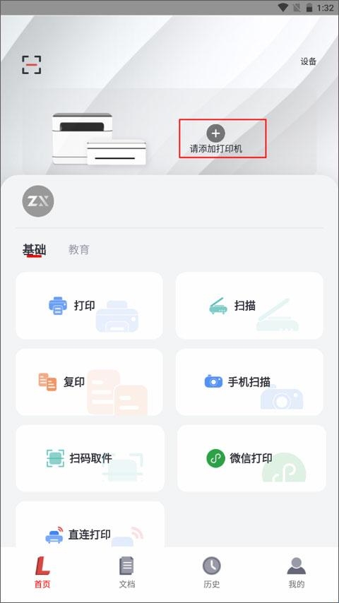 (1)进入首页,浏览基础和教育两大功能模块,点击上方的“请添加打印机”。