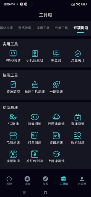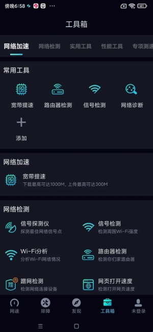 2、在工具箱网络加速这一板块中可以进行宽带提速,下载最高可达1000M,上传最高可达3000M