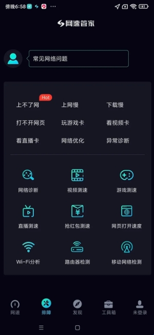 1、在网速管家极速版中,点击排障,有什么不明白的在此几乎都可以帮你解答疑惑