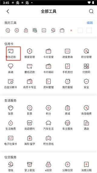 1、点击进入软件首页,里面为用户提供了非常多的工具,如彩票、积分、商城、进度查询、卡牌管家等等我们点击全部;