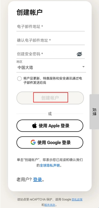 3、进入创建账户页面之后,填写诶邮箱和密码,最后勾选下方的更新服务,之后点击创建即可,最后回到首页进行登录即可。