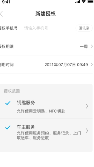 填写对方注册的手机号码,选择授权期限;选择授权范围(包括钥匙服务和车主服务可以按需选择),点击授权,若勾选了钥匙服务,需要输入操作密码验证。
