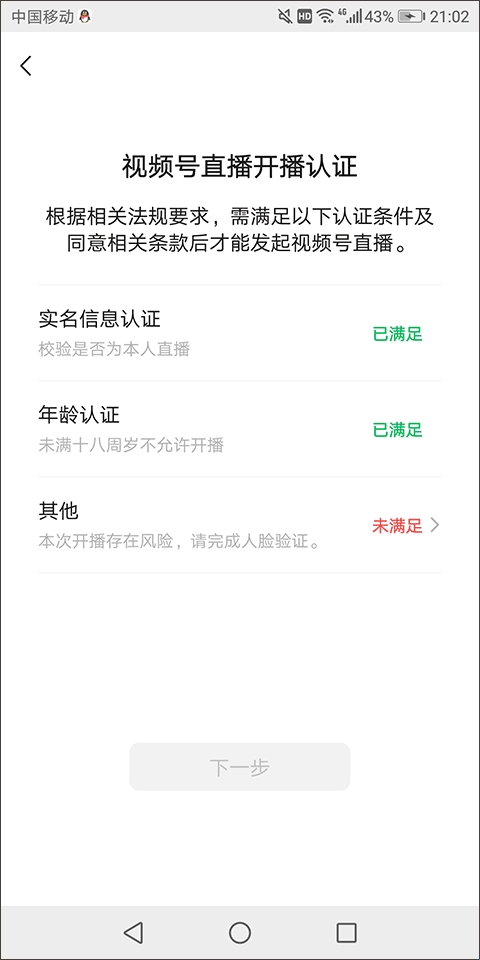 4、在这里完成对实名认证信息、年龄认证、其他信息进行填写后找到并点击“下一步”选项;
