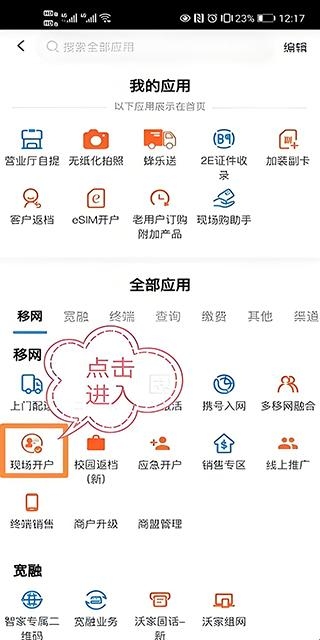 2、进入“应用”界面后,点击“全部应用”下面的“现场开户”;