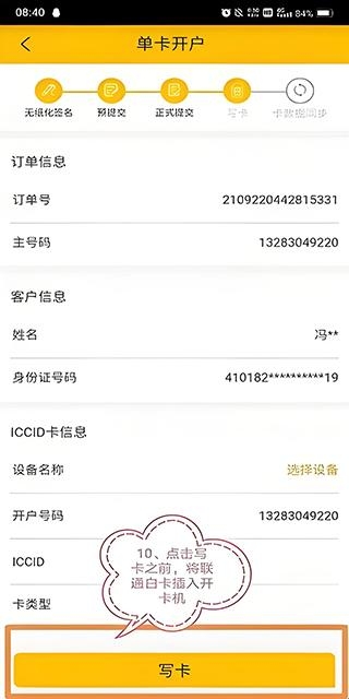 9、完成签名后,点击“写卡”,写卡之前,将联通白卡插入开卡机,注意不要插错。