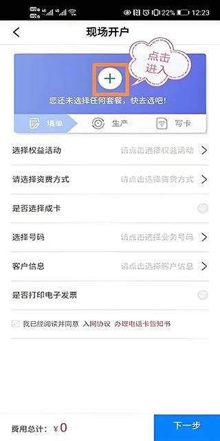 3、来到“现场开户”后,点击上面中间的“+”,添加你的套餐;