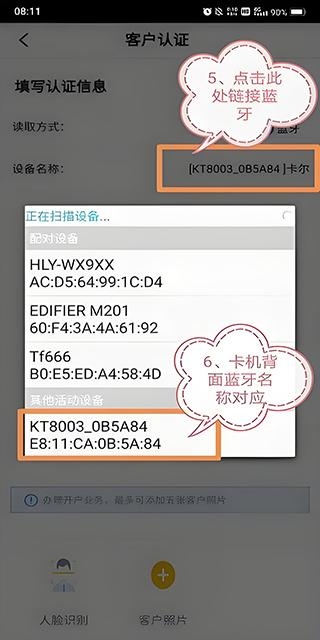5、开卡器卡机,手机链接次蓝牙;客户认证界面点击“设备名称”进行蓝牙连接;