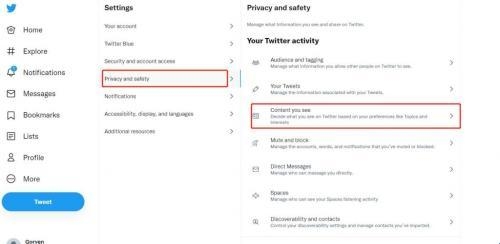 3、在【设置Settings】中找到 【隐私和安全 Privacy and safety】右侧 【你看到的内容 Content you see】。