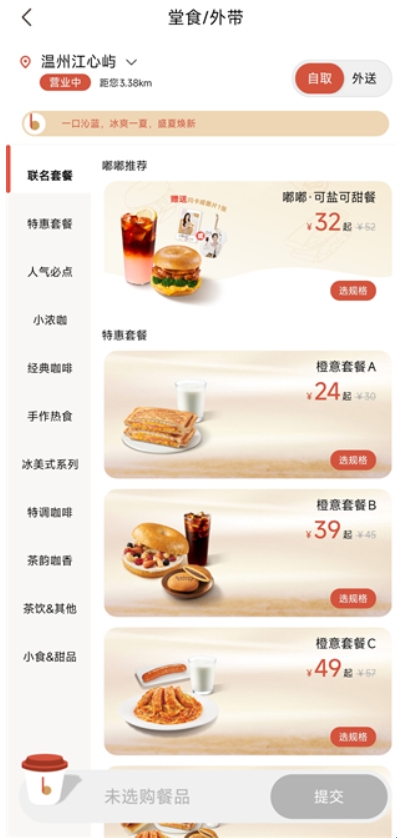 3、商品品类十分丰富,涵盖套餐、咖啡、吐司、皇冠圈、蛋糕、茶饮、特调咖啡等,兼顾饮品与轻食,满足多元需求。