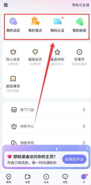 4、进入我的个人中心可以集中管理已发布的所有动态内容记录个人观点信息查看认证状态并设置个性化标签。