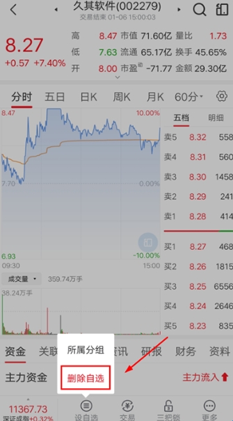 5、对于不看好的自选股,用户可点击进入该股票页面,点击下方的【设自选】-【删除自选】,将其删除在自选页面;