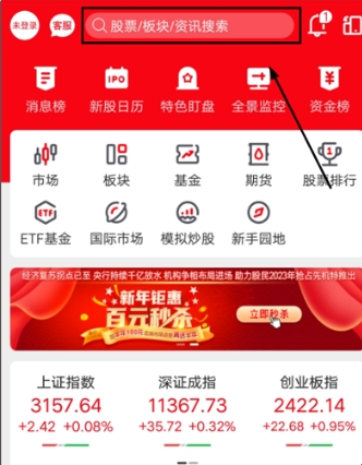 1、打开登录指南针股票app,在点击首页上方【搜索栏】查找;