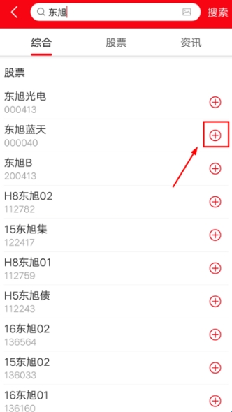 2、在【搜索栏】内输入自己需要的股票进行搜索查找,出现搜查结果后,点击股票旁边的【+】图标将其加入自选股内;