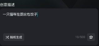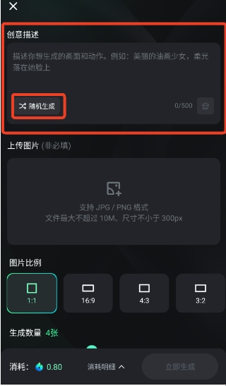 2、输入你想要的描述内容,支持中英文输入,字数不超过500个字符。如果灵感不足,也可以选择随机生成。建议提供详细、清晰的提示词,结构可以按照:“主体+行为、特征、情景、情感+时间+环境+动作+质感、构图、色调、细节”的方式来编写。
