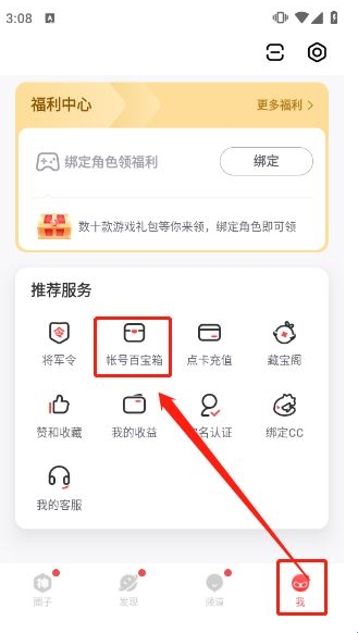 1、打开网易大神APP,选择屏幕右下角【我】页面,选择【帐号百宝箱】选项点击进入;