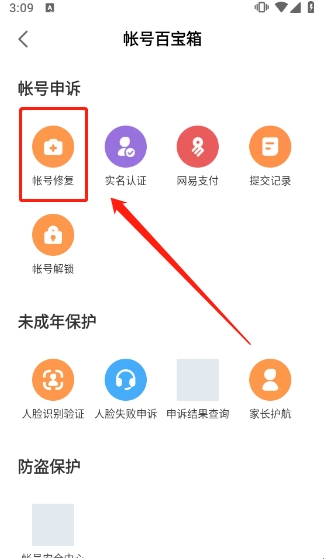2、在“帐号百宝箱”页面,选择【帐号修复】选项,即可。