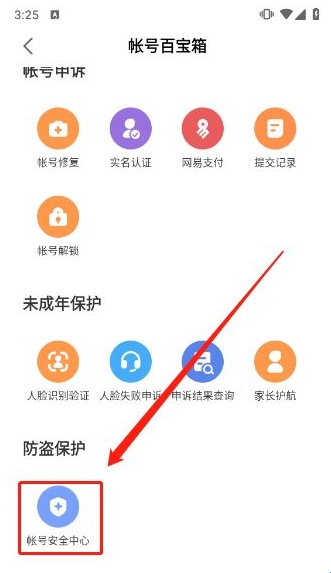 2、进入后下滑找到"账号安全中心"并打开。