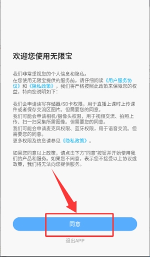 1、打开应用后在欢迎页面的弹窗内点击同意按钮,确认服务协议与政策。