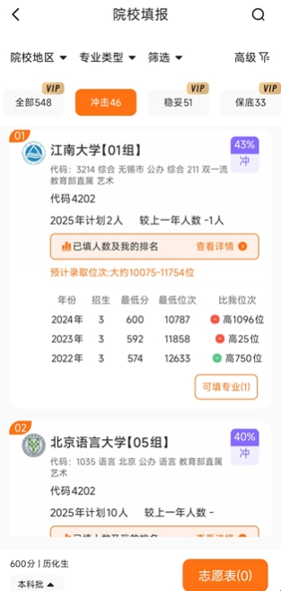 根据自己的喜好可通过地区、类型等条件筛选院校,方便快速精准找到喜欢的院校;