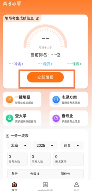 智能志愿填报模式,选择对应的身份、输入成绩等即可快速评估,知道填报情况;