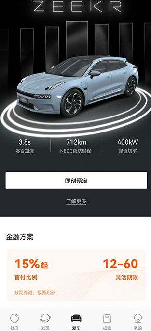 2、社区模块主要支持车主生活、用车体验等内容互动;商城模块负责极物商城的好物分享和积分兑换;爱车模块则可实现在线下定、了解购车指南等功能。