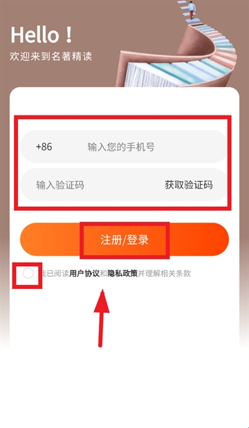 2、跳转到登录界面后,输入手机号,验证码,勾选我已阅读用户协议和隐私政策并理解相关条款,点击登录/注册即可