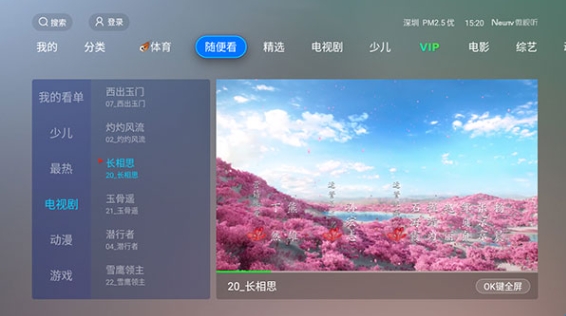 3、如果不知道想看什么,可以点击随便看,电视会自动推荐给你热门好看的频道;