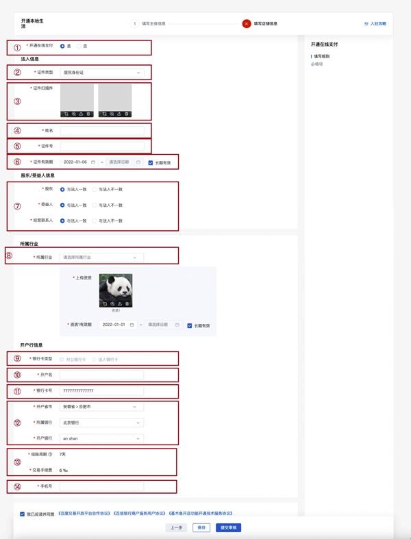 4、入驻本地生活需要完成三个步骤:填写主体信息 -填写店铺信息 -开通在线支付(非必填)。提交材料后进入审核环节,一般1-2天完成,之后会以短信形式通知您。