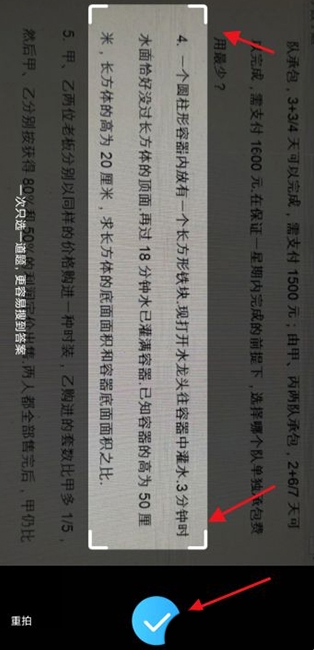 4、拍摄完成后移动图中4角裁剪有效题目区域,点击下方勾选。