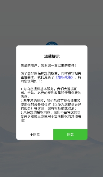 打开软件阅读“温馨提示”内容点击“同意”点击进入