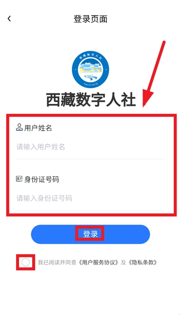 在登录界面输入姓名,身份证号,勾选我已阅读并同意《用户服务协议》及《隐私条款》,点击登录即可
