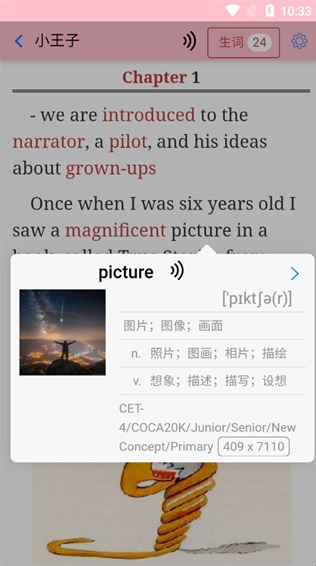 当用户遇到不认识的单词,用户可以点击单词,软件会为用户给出详细的注解;